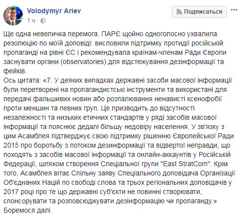"Еще одна небольшая победа. ПАСЕ только что единогласно приняла резолюцию по моему докладу: выразила поддержку противодействию российской пропаганде на уровне ЕС и рекомендовала странам - членам Совета Европы учредить органы (observatories) для отслеживания дезинформации и фейков", - отметил Арьев.