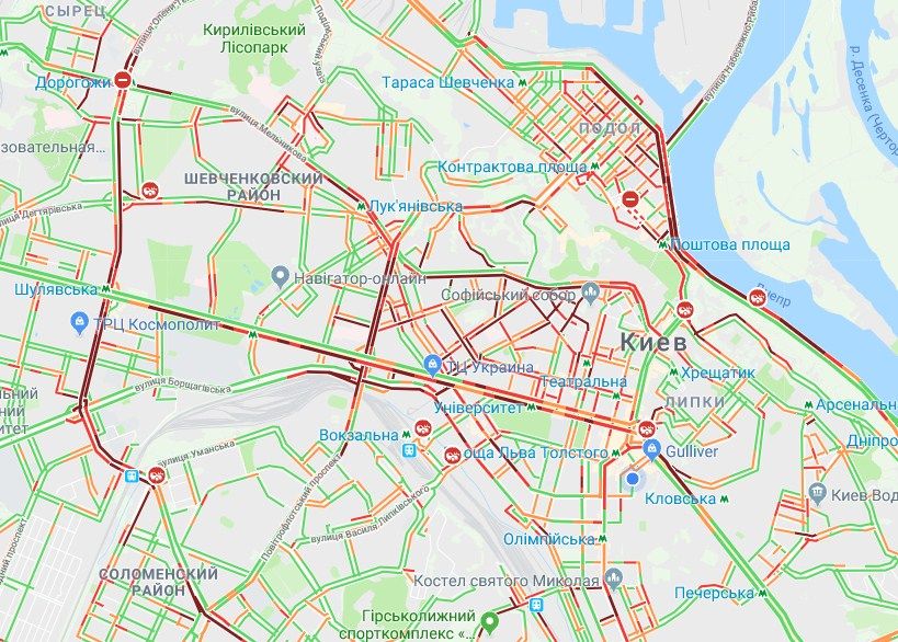 Традиционно медленно движутся автомобили в районе центральных станций метро: "Театральная", "Льва Толстого", "Университет", "Крещатик", "Майдан Независимости" и "Дворец спорта".