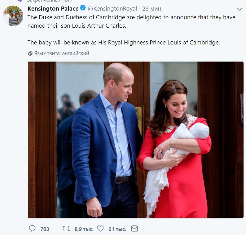 Герцог и герцогиня Кембриджские официально объявили имя своего третьего ребенка. Об этом сообщается в Twitter Кенсингтонского дворца.
