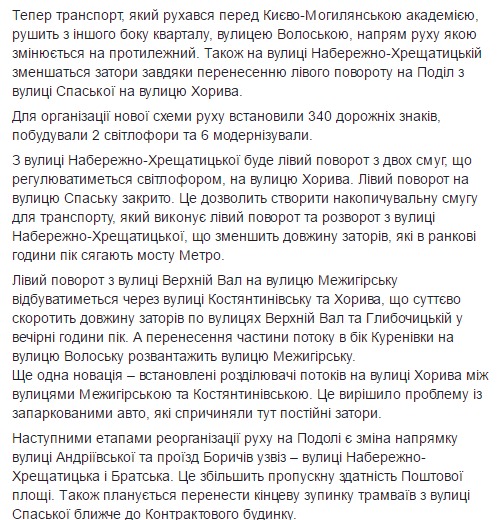 По новой схеме транспорт, который двигался перед Киево-Могилянской академией, пустят с другой стороны квартала, по улице Волошской, при чем направление движения изменится на противоположное. Левый поворот на Подол с ул. Спасской планируют перенести на ул. Хорива - ожидается, что благодаря этому на ул. Набережно-Крещатицкой уменьшатся пробки.