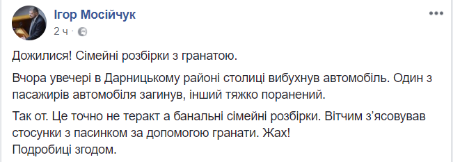 Версию о бытовых мотивах случившегося поддерживает и нардеп от Радикальной партии Игорь Мосийчук. Он назвал инцидент на Драгоманова "семейными разборками". "Это точно не теракт, а банальные семейные разборки. Отчим выяснял отношения с пасынком с помощью гранаты. Ужас!" – написал он в Facebook.