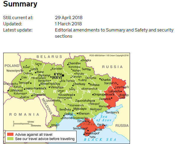 По ситуации в Киеве и других районах за пределами Донецка и Луганска, то по данным британского МИД, она в целом спокойна, однако отмечается, что здесь регулярно проводятся публичные демонстрации, из-за которых могут перекрываться дороги.