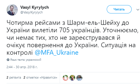 "Четырьмя рейсами из Шарм-эль-Шейха в Украину вылетели 705 украинцев. Уточняем, нет тех, кто не зарегистрировался и ожидает возвращения в Украину. Ситуация на контроле МИД Украины, - написал чиновник в своем микроблоге в Twitter.