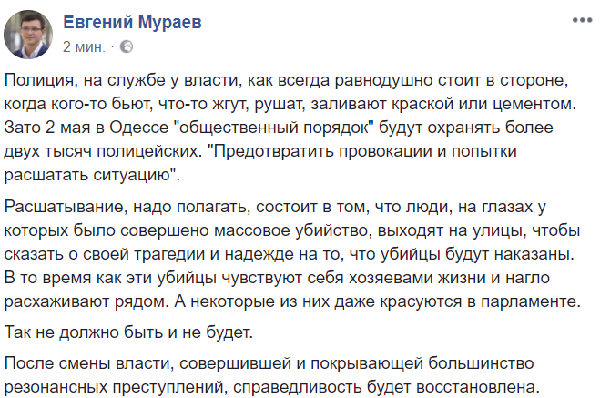 Нардеп Евгений Мураев рассуждает о восстановлении справедливости: "Полиция, на службе у власти, как всегда равнодушно стоит в стороне, когда кого-то бьют, что-то жгут, рушат, заливают краской или цементом. Зато 2 мая в Одессе "общественный порядок" будут охранять более двух тысяч полицейских. "Предотвратить провокации и попытки расшатать ситуацию".