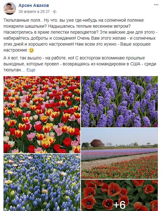 Сам же министр внутренних дел Арсен Аваков сегодня не написал ничего, а в последней своей записи от 30 апреля любовался тюльпанными полями в Голландии.
