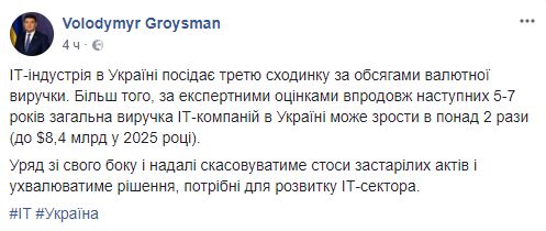 Премьер Владимир Гройсман написал о перспективах украинской IT-отрасли.