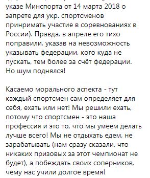"Меня уверили, что все будет в порядке: "Не беспокойся, а тренируйся". И я тренировался на высоких оборотах – ведь каким-то образом украинские спортсмены последние четыре года поднимали украинские флаги на соревнованиях в России, привозили оттуда победы. И что примечательно, ни у кого не возникало вопросов!" – написал спортсмен.