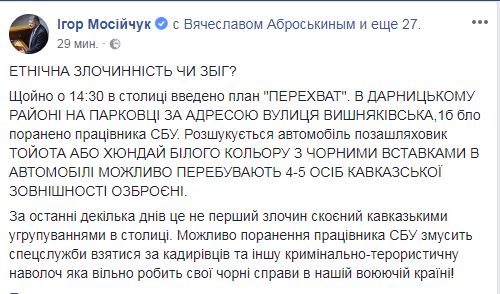 Сегодня в Дарницком районе Киева на парковке группа кавказцев ранила сотрудника СБУ.