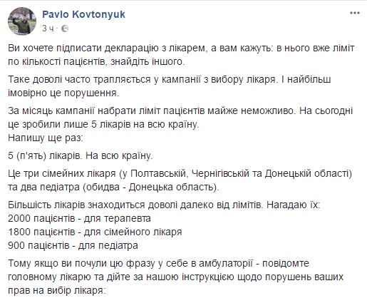 "За месяц кампании набрать лимит пациентов почти невозможно. На сегодня это сделали только 5 врачей на всю страну. Это три семейных врача (в Полтавской, Черниговской и Донецкой областях) и два педиатра (оба - Донецкая область). Большинство врачей находятся достаточно далеко от лимитов", - отметил Ковтонюк.