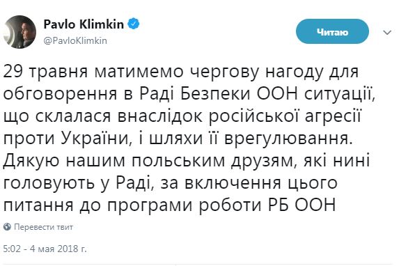 "29 мая будем иметь очередную возможность для обсуждения в Совете Безопасности ООН ситуации, сложившейся в результате российской агрессии против Украины, и пути ее урегулирования. Спасибо нашим польским друзьям, которые сейчас председательствуют в Совете, за включение этого вопроса в программу работы СБ ООН", - написал он.