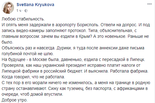 Заместителя главного редактора "Страны" Светлану Крюкову задержали в аэропорту "Борисполь" по прилете в Украину.
