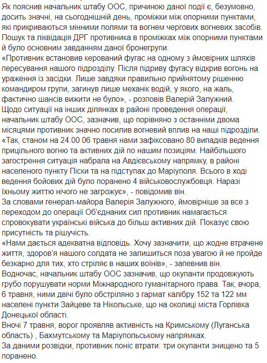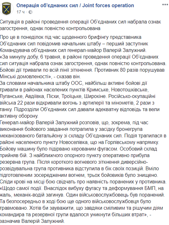 "Боевые действия продолжались по всей линии соприкосновения. Противник 80 раз нарушал Минские договоренности", -заявил Залужный и добавил, что наиболее активные боевые действия продолжались в районах населенных пунктов Крымское, Новотошковское, Луганское, Авдеевка, Пески, Троицкое, Широкино.