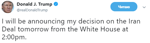 "Я объявлю о своем решении по cделке с Ираном завтра из Белого дома в 2 часа пополудни", - написал Трамп в своем Twitter.