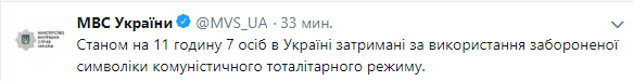 "По состоянию на 11:00 семь человек в Украине задержаны за использование запрещенной символики коммунистического тоталитарного режима", - говорится в сообщении.