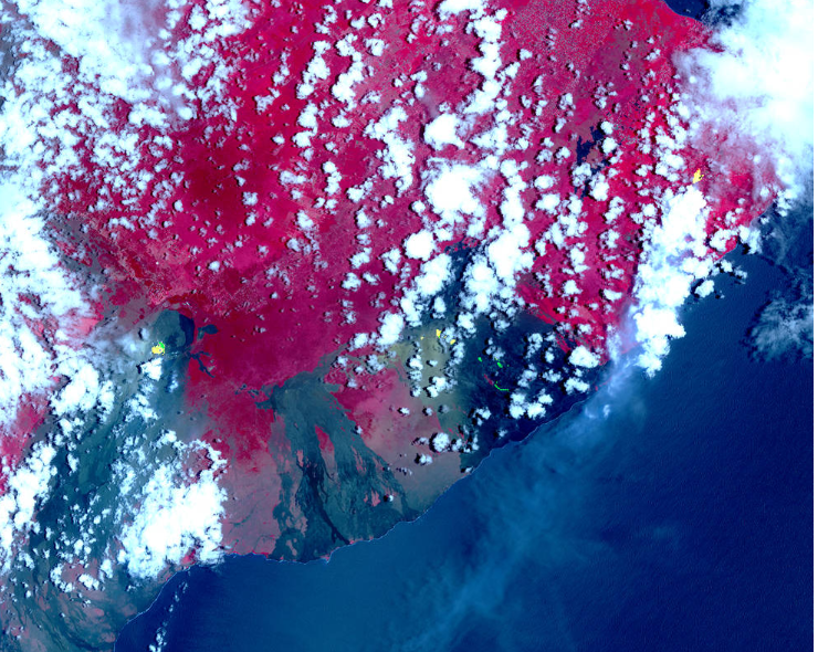 На первом фото NASA видны потоки лавы, которые обозначены на снимке черным и серым цветом. Красный цвет на фото - это растительность.