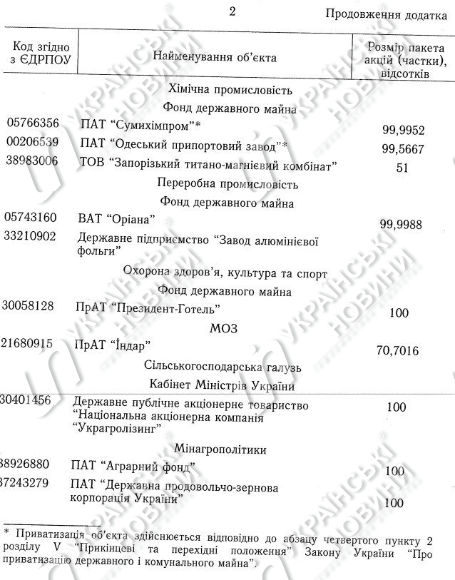 Согласно распоряжению, 18 объектов, которые находятся в управлении ФГИ будут выставлены на продажу: энергопоставляющие компании "Тернопольоблэнерго", "Запорожьеоблэнерго", "Харьковоблэнерго", "Николаевоблэнерго", "Хмельницкоблэнерго", теплоэлектроцентрали (ТЭЦ) - Херсонская ТЭЦ, Днепровская ТЭЦ, Криворожская ТЭЦ, Северодонецкая ТЭЦ, "Азовмаш", "Турбоатом", Запорожский титано-магниевый комбинат, "Ориана", Завод алюминиевой фольги, "Президент-Отель", "Центрэнерго", Одесский припортовый завод и "Сумыхимпром".