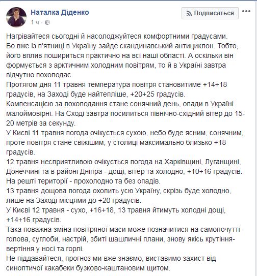 "Уже с пятницы в Украину зайдет скандинавский антициклон. То есть, его влияние распространится практически на все наши области. А поскольку он формируется с арктическим холодным воздухом, то и в Украине завтра ощутимо похолодает. В течение дня 11 мая температура воздуха составит +14...+18 градусов, на западе будет теплее, +20...+25 градусов", - пишет она.