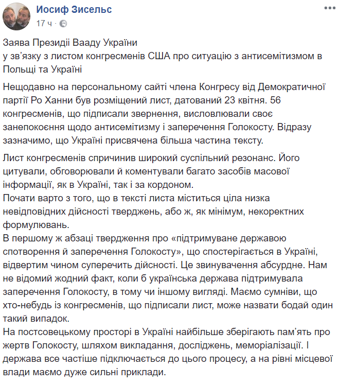 "В последнем случае письма у нас нет (возможно, пока нет) информации о том, кто был причастен к написанию текста (вряд ли персонально Ро Ханна был на это способен) ... Достаточно правдоподобным будет предположение, что его появление является частью новой волны антиукраинской пропаганды спекуляции на теме антисемитизма", - пишет глава ВААД.