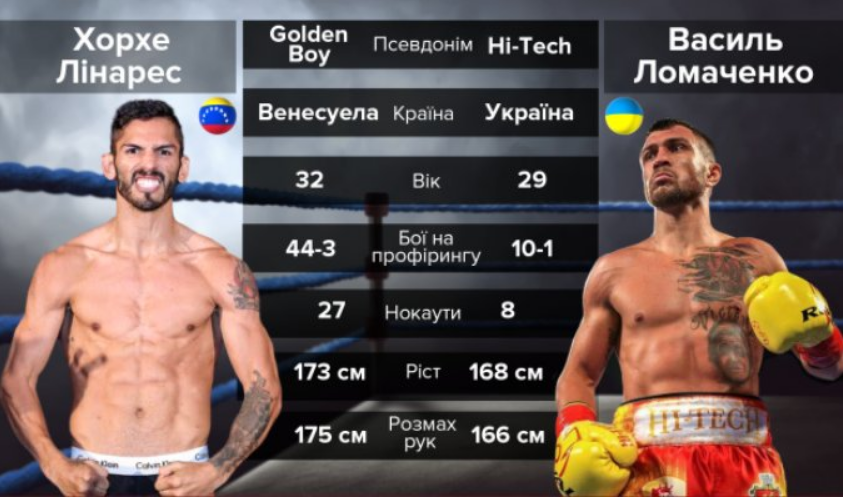 Для украинца нынешний бой станет дебютным в легком весе (до 61.2 кг). Промоутер Ломаченко - Боб Арум заявил, что пока можно лишь догадываться о возможностях нашего боксера в новой для него категории. С другой стороны, Хорхе Линарес не знает поражений в этом весе с 2012 года.