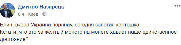 "Блин, вчера Украина порннау, сегодня золотая картошка. Кстати, что это за жёлтый монстр на монете хавает наше единственное достояние?", - пишет юрист Дмитрий Назарец.
