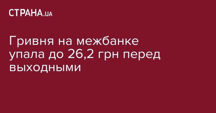 Курс гривни на межбанковском валютном рынке в пятницу снизился до 26,2 грн/$1 с 26,1775 грн/$1 в предыдущий рабочий день, сообщили агентству "Интерфакс-Украина" дилеры коммерческих банков.