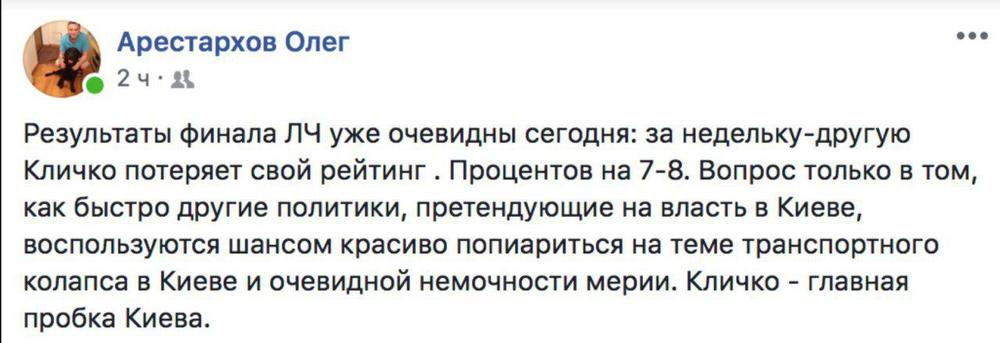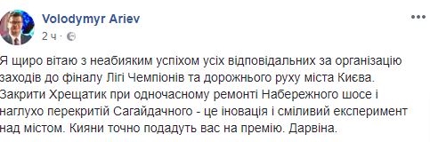 "Я искренне поздравляю с большим успехом всех ответственных за организацию мероприятий к финалу Лиги чемпионов и дорожного движения города Киева. Закрыть Крещатик при одновременном ремонте Набережного шоссе и наглухо перекрытой Сагайдачного – это инновация и смелый эксперимент над городом. Киевляне точно подадут вас на премию. Дарвина", – написал народный депутат Владимир Арьев.