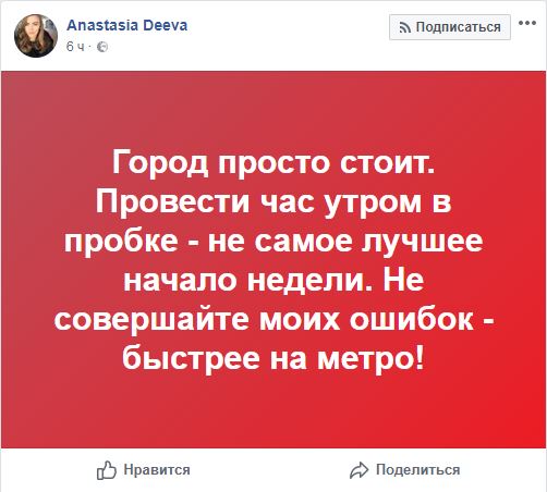 "Город просто стоит. Провести час утром в пробке – не самое лучшее начало недели. Не совершайте моих ошибок – быстрее на метро!" – написала в Facebook бывшая заместительница главы МВД Арсена Авакова Анастасия Деева.