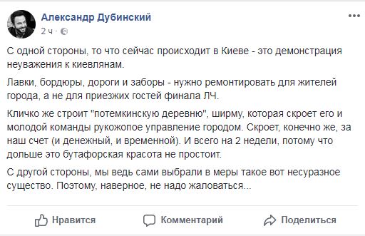 "С одной стороны, то что сейчас происходит в Киеве – это демонстрация неуважения к киевлянам. Лавки, бордюры, дороги и заборы нужно ремонтировать для жителей города, а не для приезжих гостей финала ЛЧ. Кличко же строит "потемкинскую деревню", ширму, которая скроет его и молодой команды рукожопое управление городом. Скроет, конечно же, за наш счет (и денежный, и временной). И всего на две недели, потому что дольше эта бутафорская красота не простоит. С другой стороны, мы ведь сами выбрали в мэры такое вот несуразное существо. Поэтому, наверное, не надо жаловаться", – пишет журналист Александр Дубинский.