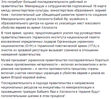 В то же время, однако, продолжающиеся усилия под руководством правительственного Украинского института национальной памяти восхваления определенных лидеров Организации украинских националистов (ОУН) и Украинской повстанческой армии (УПА) и очистки их кровавой репутации вызывает сомнения в отношении намерений правительства.