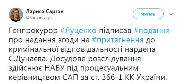 Об этом сообщает пресс-секретарь генпрокурора Лариса Сарган в Twitter.