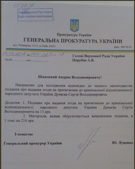 Генпрокурор Украины Юрий Луценко подписал представление о согласии на привлечение к уголовной ответственности нардепа от "Оппозиционного блока" Сергея Дунаева.