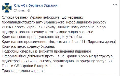 "Уголовное производство, открытое по ч. 1 ст. 111 (Государственная измена) Уголовного кодекса Украины. Подробности операции по разоблачению проведения подрывной информационной деятельности против нашей страны со стороны медиаструктурах, подконтрольных Вышинскому, обнародовал на брифинге заместитель Председателя СБ Украины Виктор Кононенко. Продолжается досудебное следствие," - говорится в сообщении.