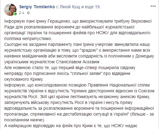 "Информирую госпожу Ирина Геращенко, что использовать трибуну Верховной Рады для разжигания вражды к самой большой журналистской организации Украины и распространение фейков о НСЖУ для ответственного политика недопустимо. Сегодня на заседании парламента госпожа Ирина в очередной раз обвинила нашу журналистскую организацию в том, что "предательством" является использование нами всех имеющихся площадок для выражения солидарности с плененным в Донецке украинским журналистом Станиславом Асеевым.