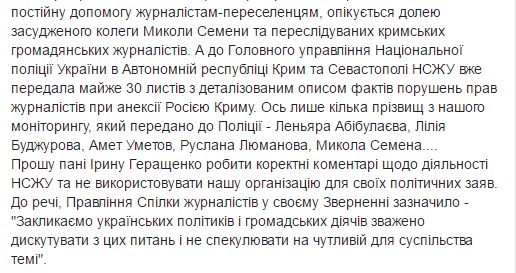 Представители НСЖУ убеждены, что лучшим опровержением данного ложного заявления Геращенко является помощь журналистам-переселенцам, забота о судьбе осужденного коллеги Николая Семены и преследуемых крымских общественных журналистов.