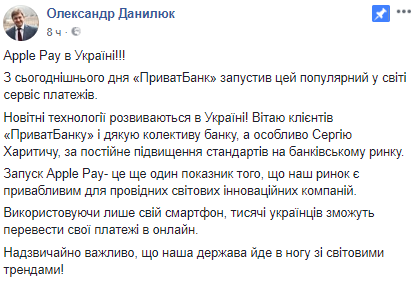 "Apple Pay в Украине! С сегодняшнего дня ПриватБанк запустил этот популярный в мире сервис платежей", – написал Данилюк.