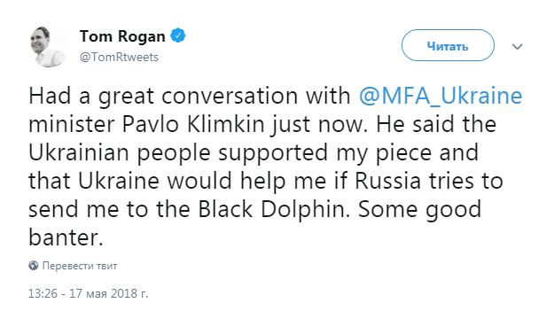 "Провел прекрасную беседу с министром Павлом Климкиным. Он сказал, что украинцы поддерживают мою статью, и Украина поможет мне, если Россия попытается отправить меня в "Черный дельфин" (колония для пожизненного заключения в России - Прим. Ред.). Немного пошутили", - написал Роган.