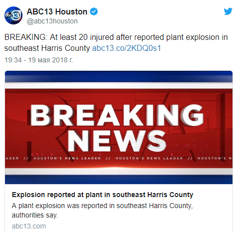 "Департамент пожарной охраны Пасадены сказал, что по меньшей мере 20 человек получили ранения после взрыва на заводе вблизи Хьюстона", - говорится в сообщении.