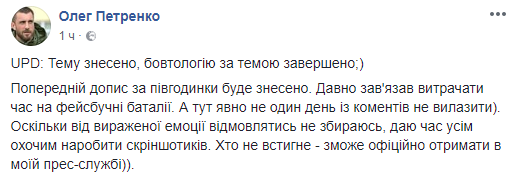 После комментариев пользователей о том, что такие призывы не должны звучать от народного депутата, Петренко удалил пост, при этом написал следующий, в котором отметил, что от выраженной эмоции отказываться не собирается.