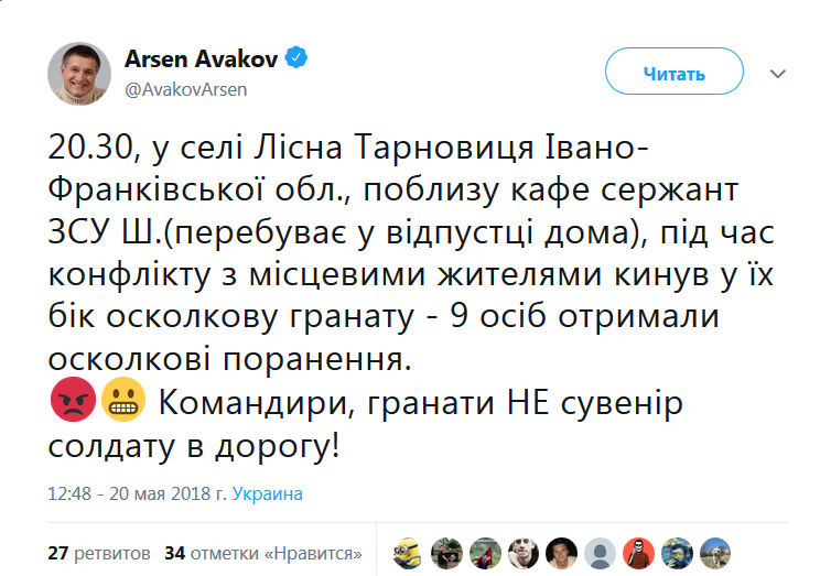 "20:30, в селе Лесная Тарновица Ивано-Франковской области, возле кафе сержант ВСУ Ш. (находится в отпуске дома), во время конфликта с местными жителями бросил в их сторону осколочную гранату – 9 человек получили осколочные ранения. Командиры, гранаты не сувенир солдату в путь!" – написал глава МВД Украины.