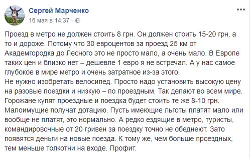 "Проезд в метро не должен стоить 8 грн. Он должен стоить 15-20 грн, а то и дороже. Потому что 30 евроцентов за проезд 25 км от Академгородка до Лесного это не просто мало, а очень мало. В Европе таких цен и близко нет – дешевле 1 евро я не встречал. А у нас самое глубокое в мире метро и очень затратное из-за этого.
