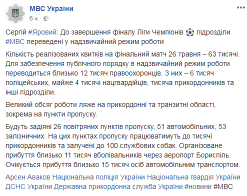 В свою очередь, первый заместитель министра внутренних дел Сергей Яровой отметил, что до завершения финала Лиги Чемпионов подразделения МВД переведены в чрезвычайный режим работы.
