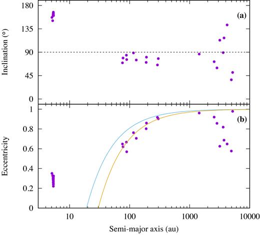 Distribution of 2015 BZ509’s clones at 4.5 billion years in the past in the semimajor axis-inclination plane (a) and the semimajor axis–eccentricity plane (b). The intersections at perihelion with the orbits of Uranus and Neptune are shown by the left and right curves, respectively. Фото: academic.oup.com