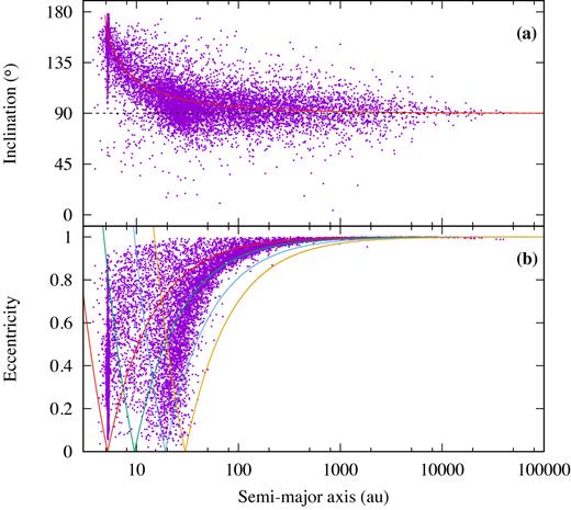 Distribution of 2015 BZ509’s clones at 40 Myr in the past in the semimajor axis-inclination plane (a) and the semimajor axis-eccentricity plane (b). The curve in (a) is given by the asteroid’s Tisserand relation with Jupiter. The four V-shaped curves in (b) denote the intersection at aphelion and perihelion of the clone’s orbit with those of Jupiter, Saturn, Uranus, and Neptune respectively from left to right. Фото: academic.oup.com