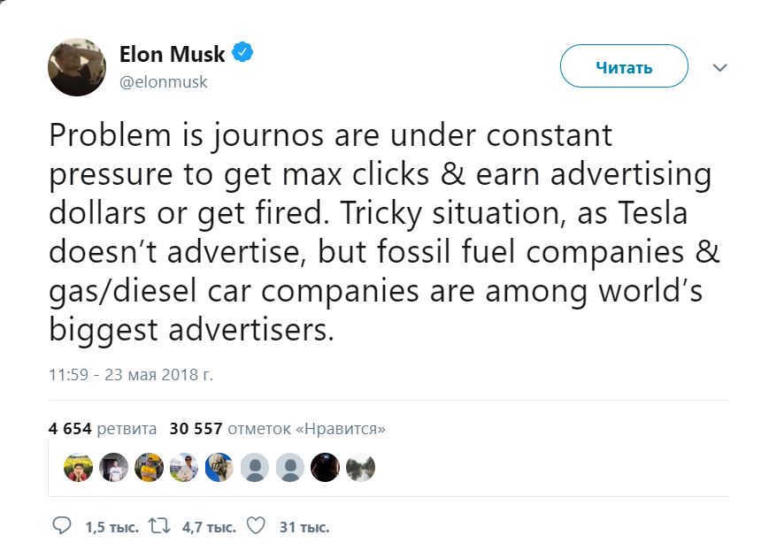 "Проблема в том, что журналисты находятся под постоянным давлением в попытке получить больше кликов и заработать на рекламе или не быть уволенными. Трудная ситуация, поскольку Tesla не даёт рекламу, но компании, добывающие топливо, и автомобильные компании, производящие бензиновые/дизельные автомобили, среди крупнейших в мире рекламодателей", - объясняет свою позицию Маск.