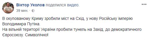 Так, блогер Виктор Уколов пишет: "В оккупированном Крыму сделали мост на восток, в новую Российскую империю Владимира Путина. На свободной территории Украины пробили тоннель на Запад, к демократическому Евросоюза. Символично!"