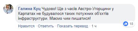 Еще один комментатор также отмечает масштабность события: "Прекрасно! Еще со времен Австро-Венгрии в Карпатах не строилось таких мощных объектов инфраструктуры. Есть чем гордиться!"