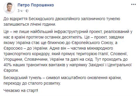 Сам Петр Порошенко у себя в Facebook написал, что открытие тоннеля "сделает Украину ближе к Европе, а Европу к Украине". Также он назвал открытие тоннеля символом масштабного обновления страны и перехода к постоянному развитию.