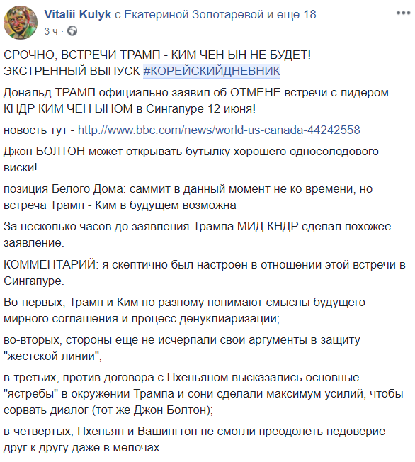 "Ну вот, а так все хорошо начиналось. Нобелевская премия мира Трампу светила... Но корейцы все равно молодцы. Если Китай и США не будут мешать, они постепенно дойдут до воссоединения", - не теряет оптимизма международник Олег Волошин.