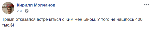 "Трамп отказался встречаться с Ким Чен Ыном. У того не нашлось 400 тыс.$!", - вторит ему блогер Кирилл Молчанов.