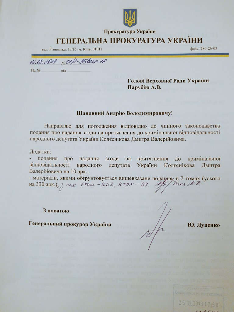 Как сообщалось, генпрокурор Украины Юрий Луценко внес в аппарат ВР представления о даче согласия парламента на привлечение к уголовной ответственности народных депутатов Колесникова и Вилкула (оба - фракция "Оппозиционный блок").